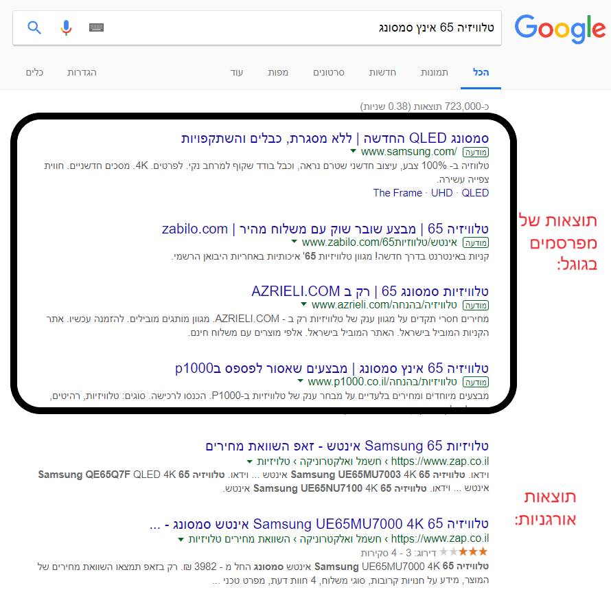 כפי שניתן לראות בצילום המסך הקרב בין המפרסמים בגוגל הוא אדיר ולוקחות בו חלק החברות הגדולות ביותר בארץ ובעולם. בצילום המסך ניתן לראות התחרות בין החברות בכדי לקבל את תנועת הגולשים שחיפשו את הטלוויזיה הספציפית הזאת.